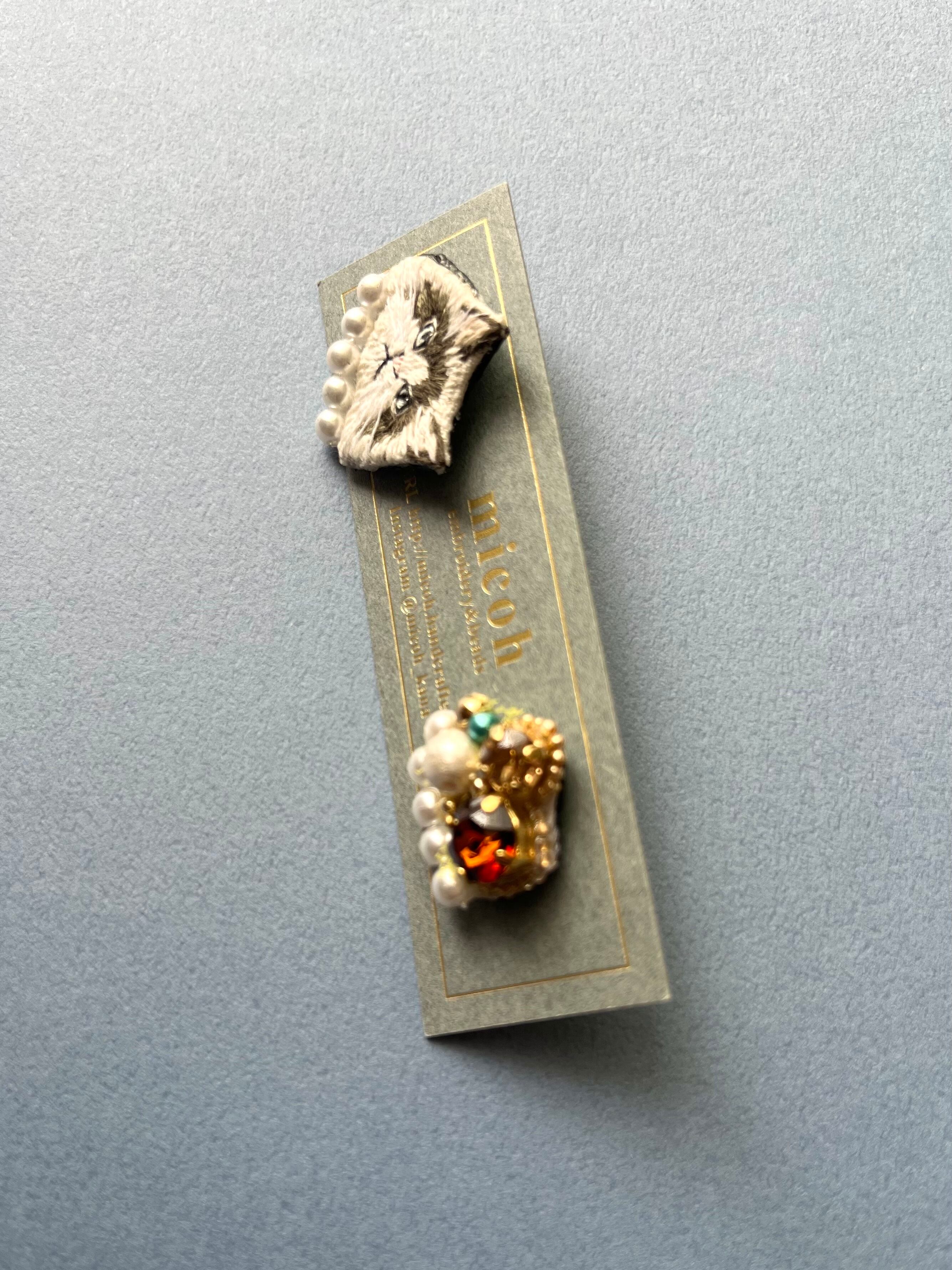 手刺繍で作った猫モチーフとビジューの、左右デザイン違いオリジナルピアスです。