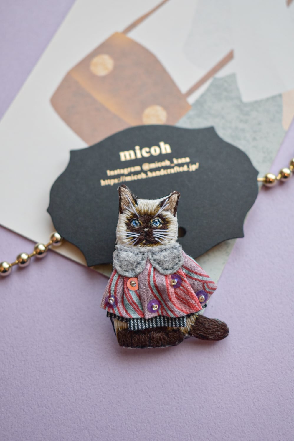 手刺繍で作った猫モチーフに、ブロックプリントやスパンコールでおめかししました。