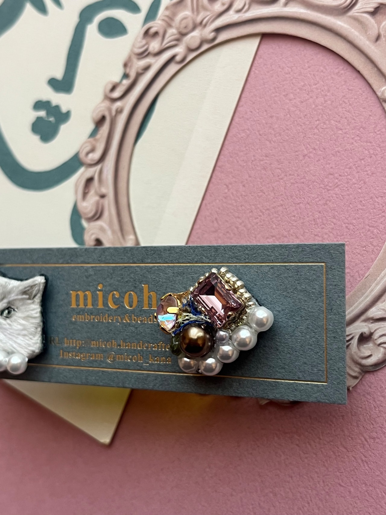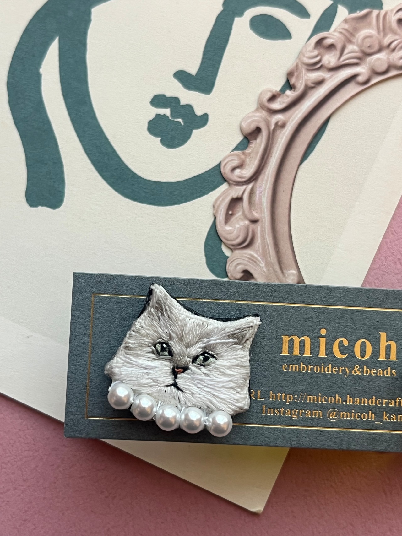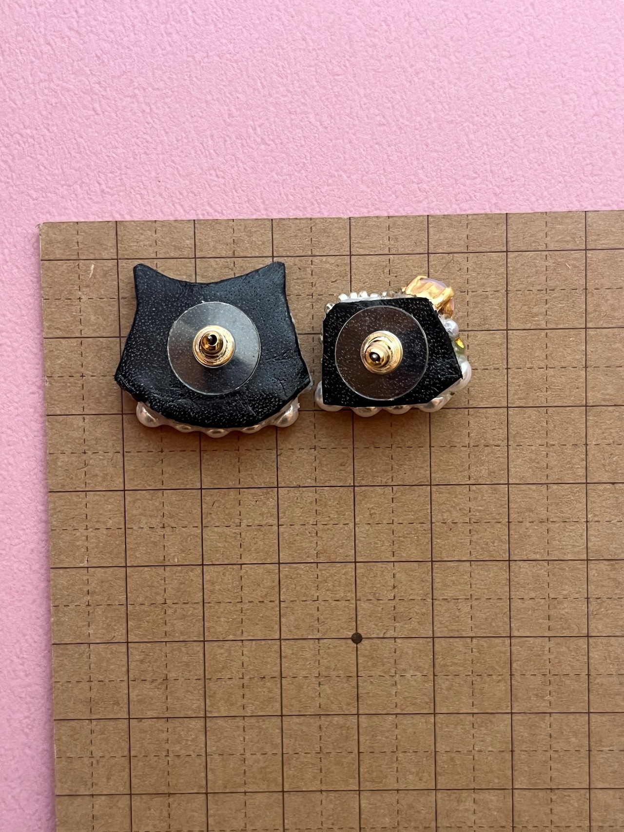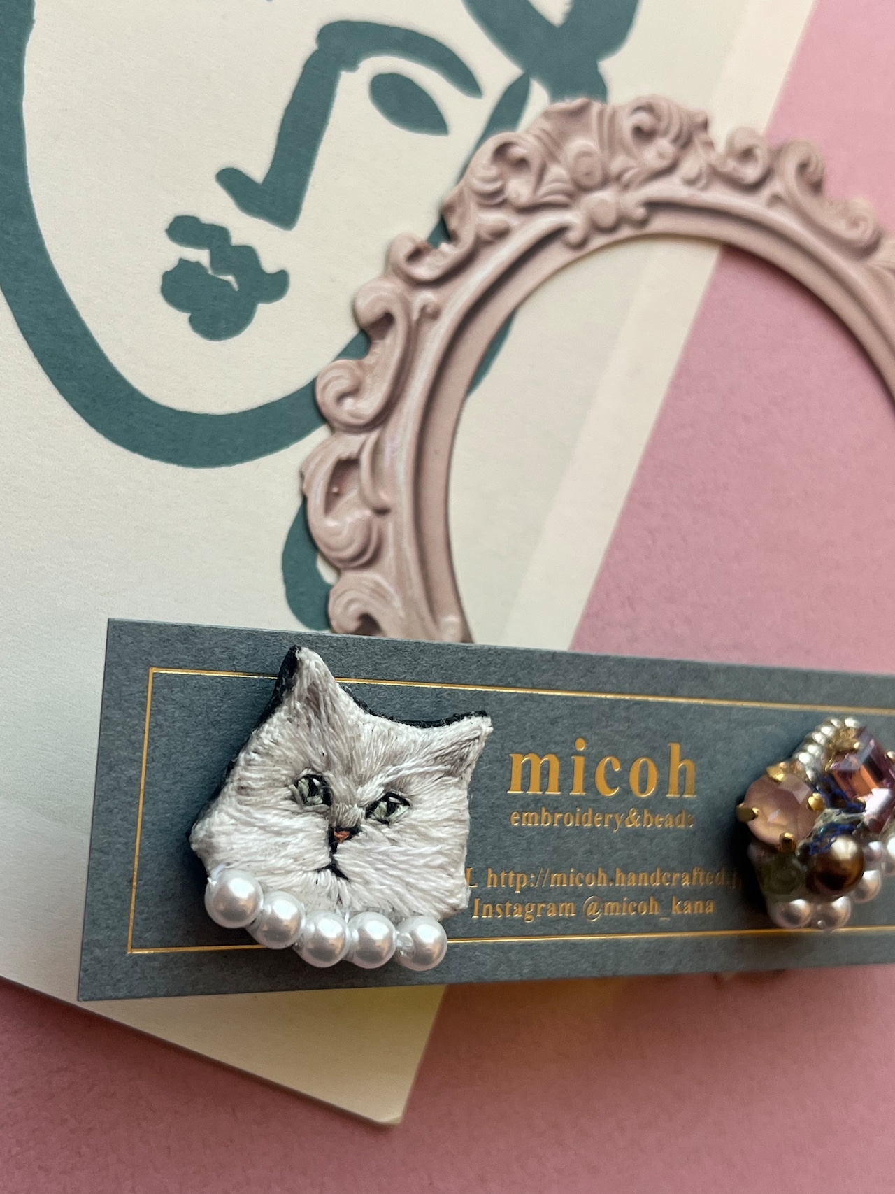 手刺繍で作った猫モチーフとビジューの、左右デザイン違いオリジナルピアスです。