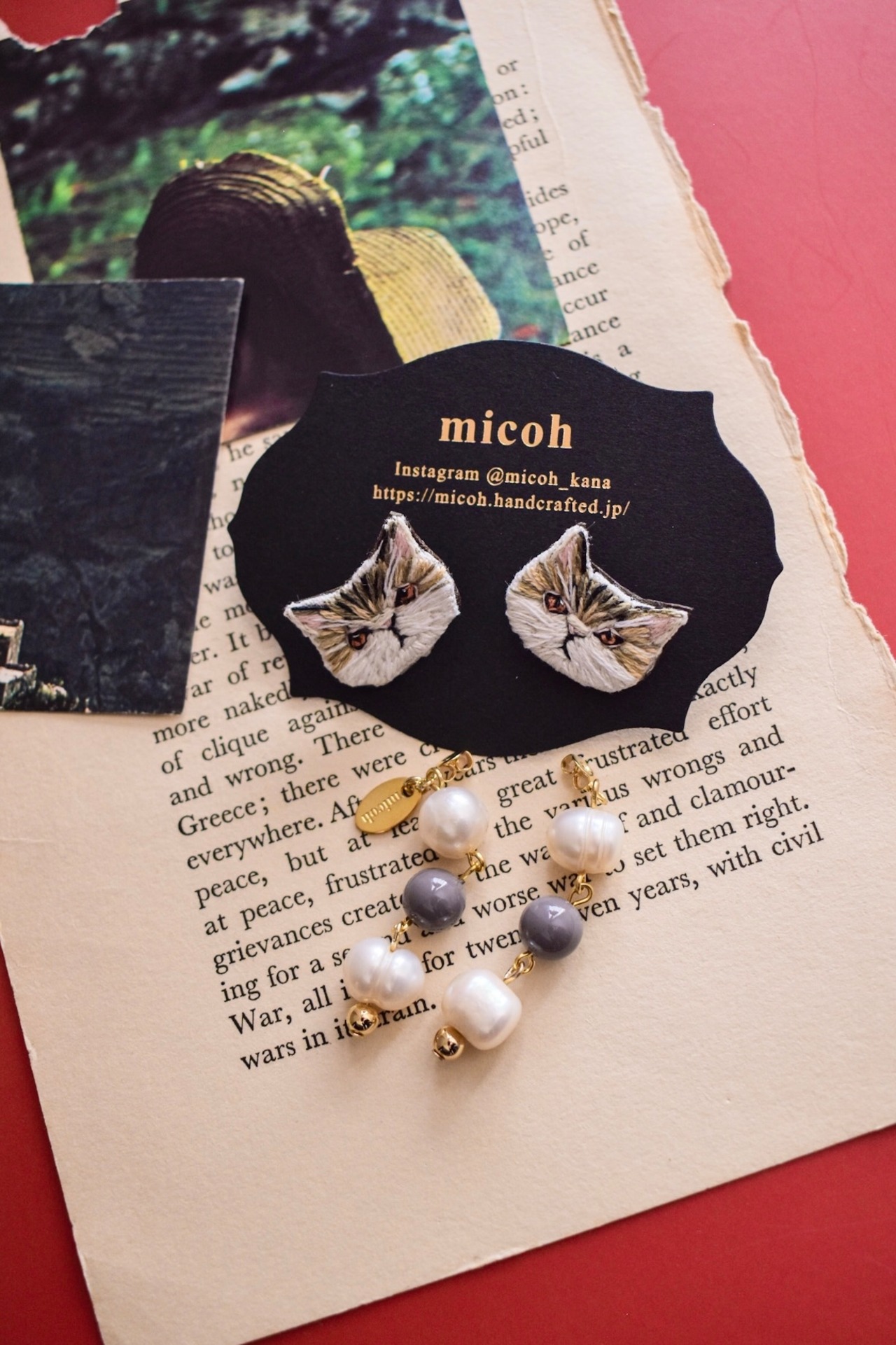 手刺繍で作ったキャットモチーフピアスです。パール、グレーのラッカービーズを組み合わせたキャッチつき、耳の後ろでパールが揺れるデザインとなります。