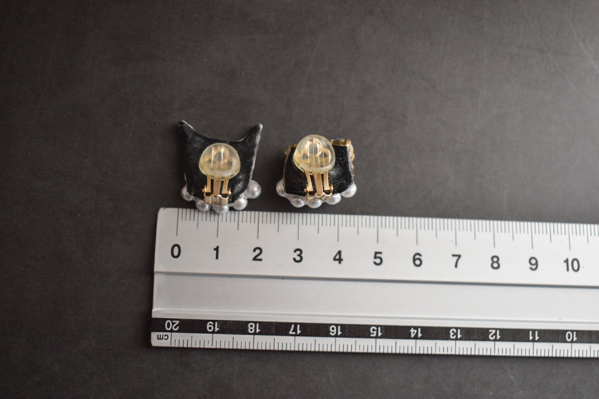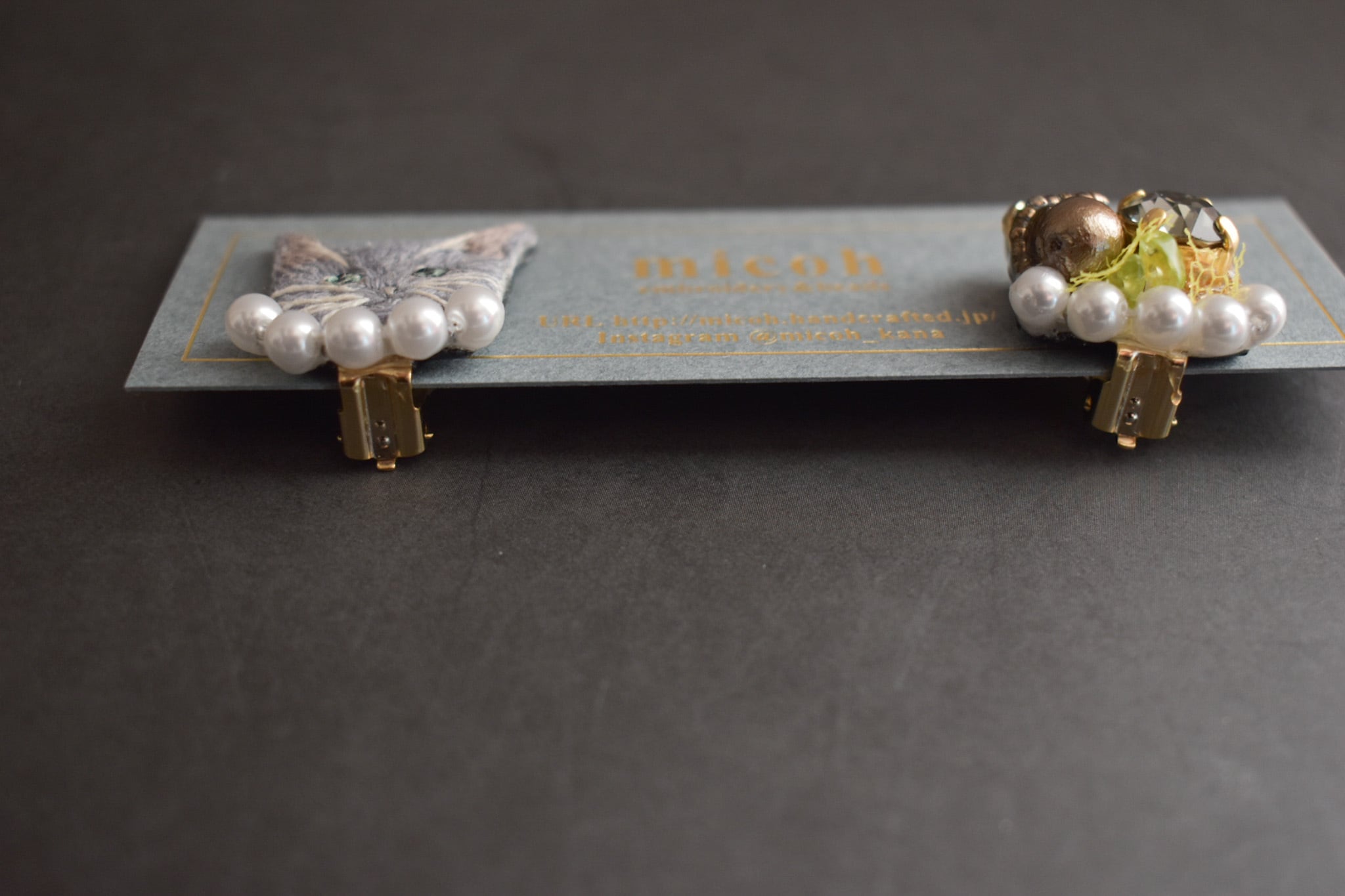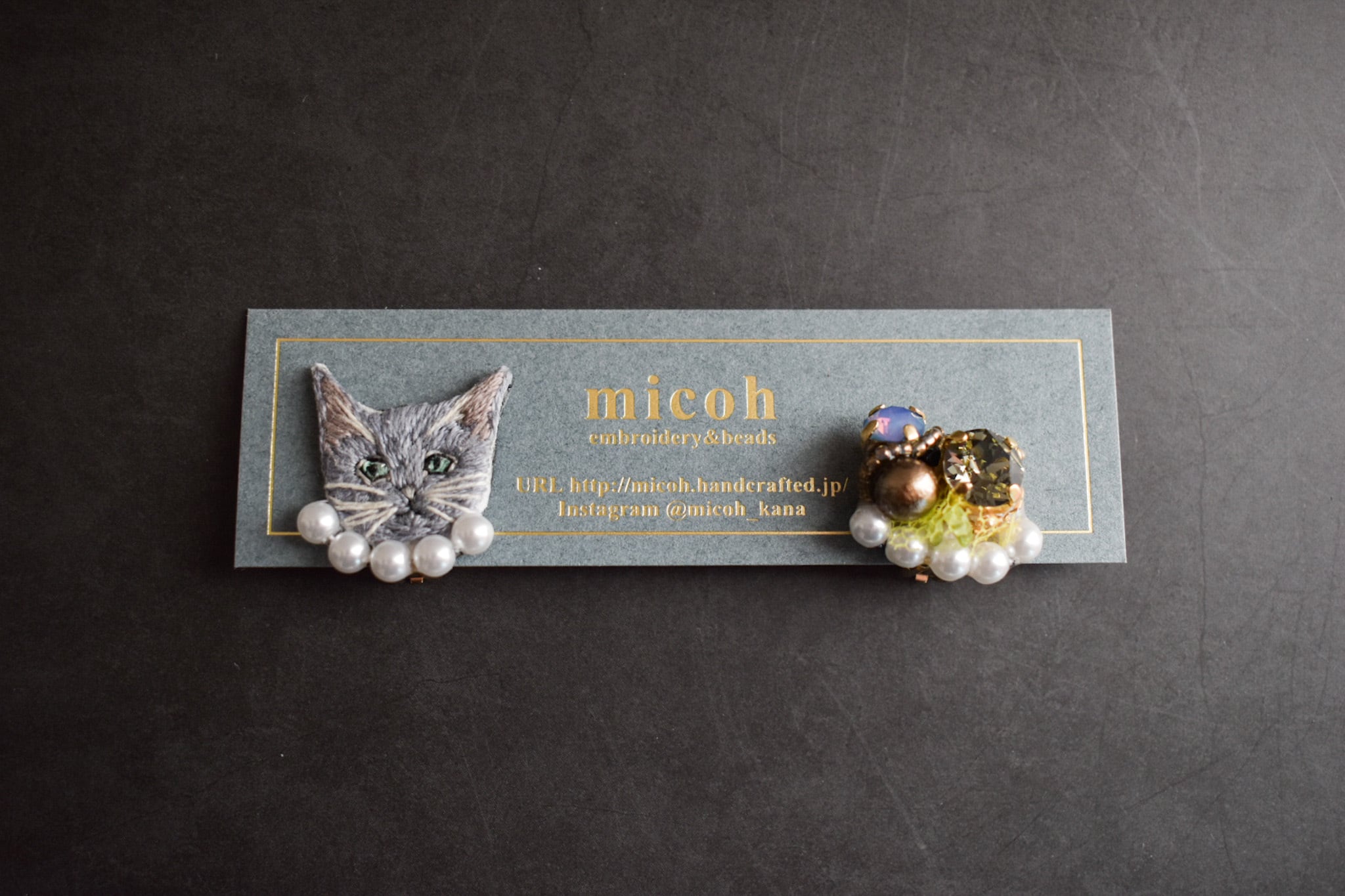 手刺繍で作った猫モチーフとビジューの、左右デザイン違いオリジナルイヤリングです。