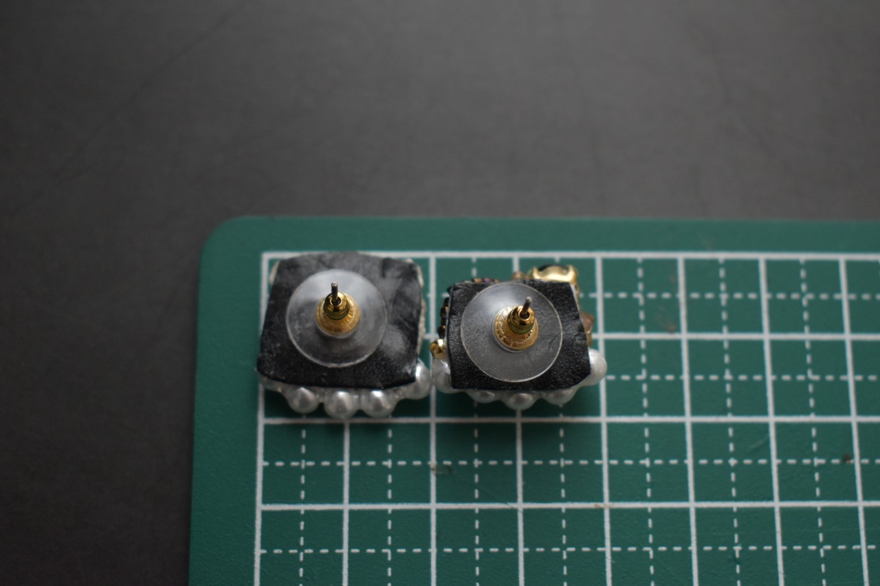 パールラインと、ビジューのパーツ間はレジンで補強しています。力を加えるとレジンが剥がれますのでお取り扱いにはお気をつけください。