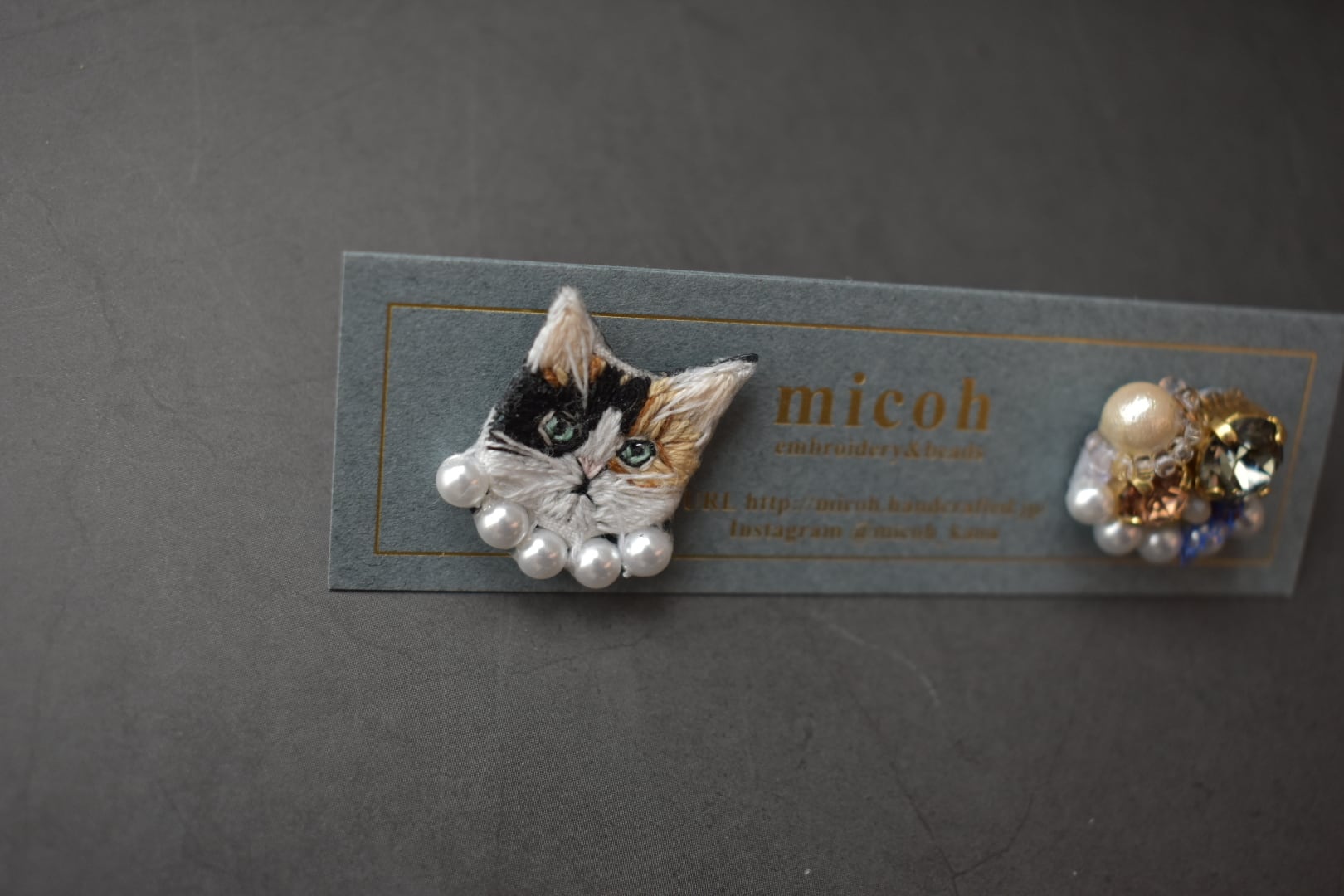 手刺繍で作った猫モチーフとビジューの、左右デザイン違いオリジナルピアスです。