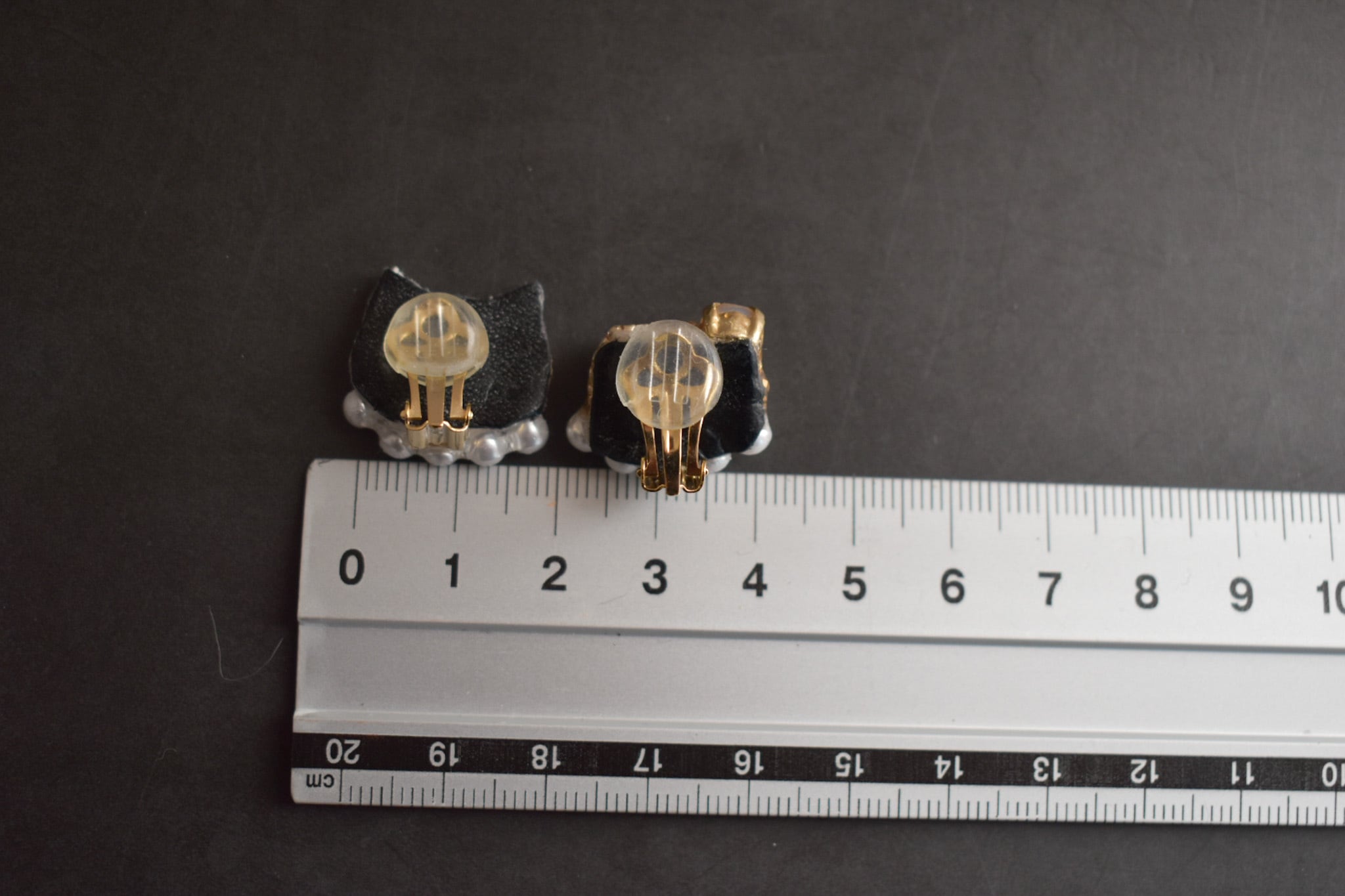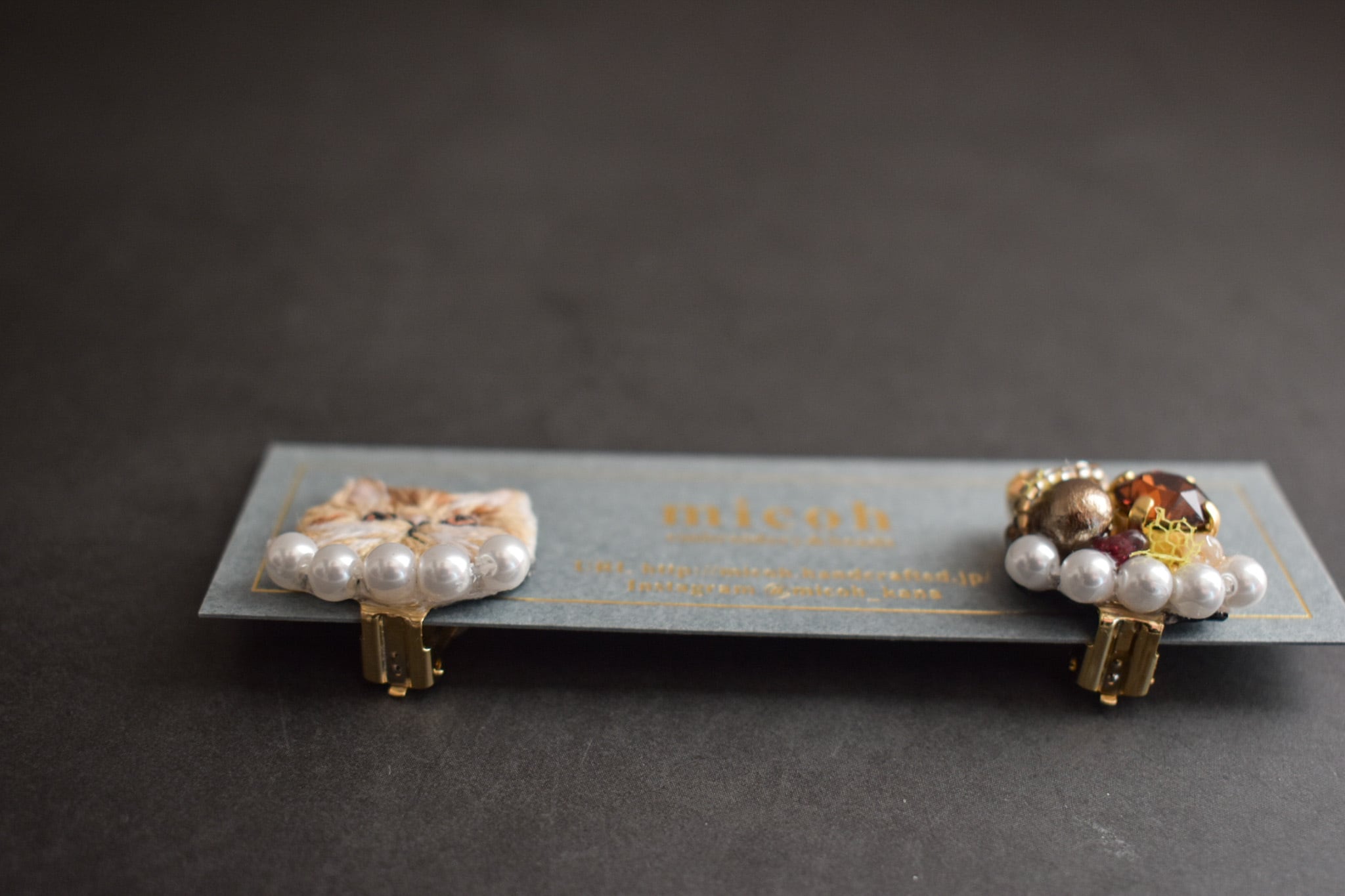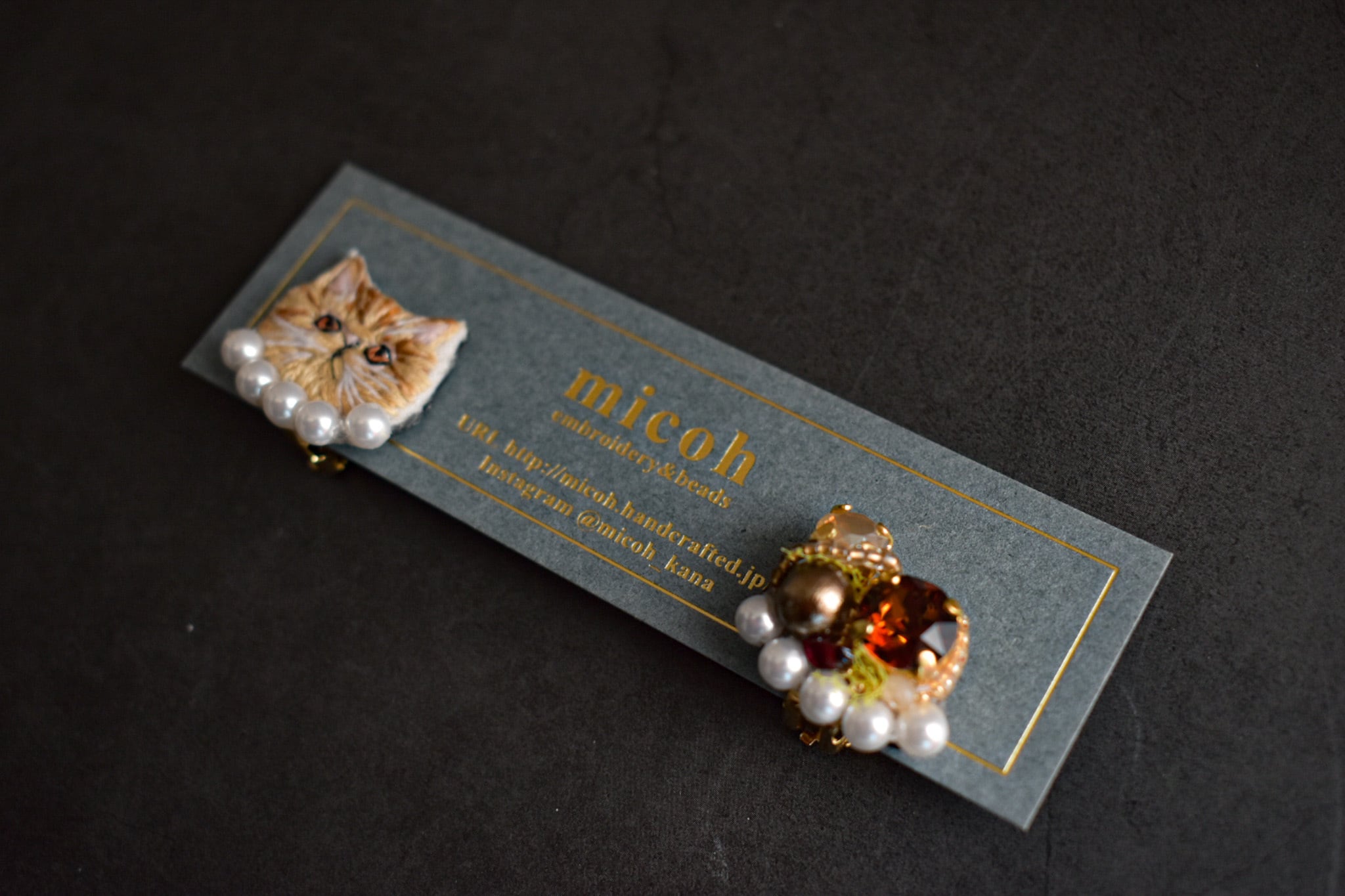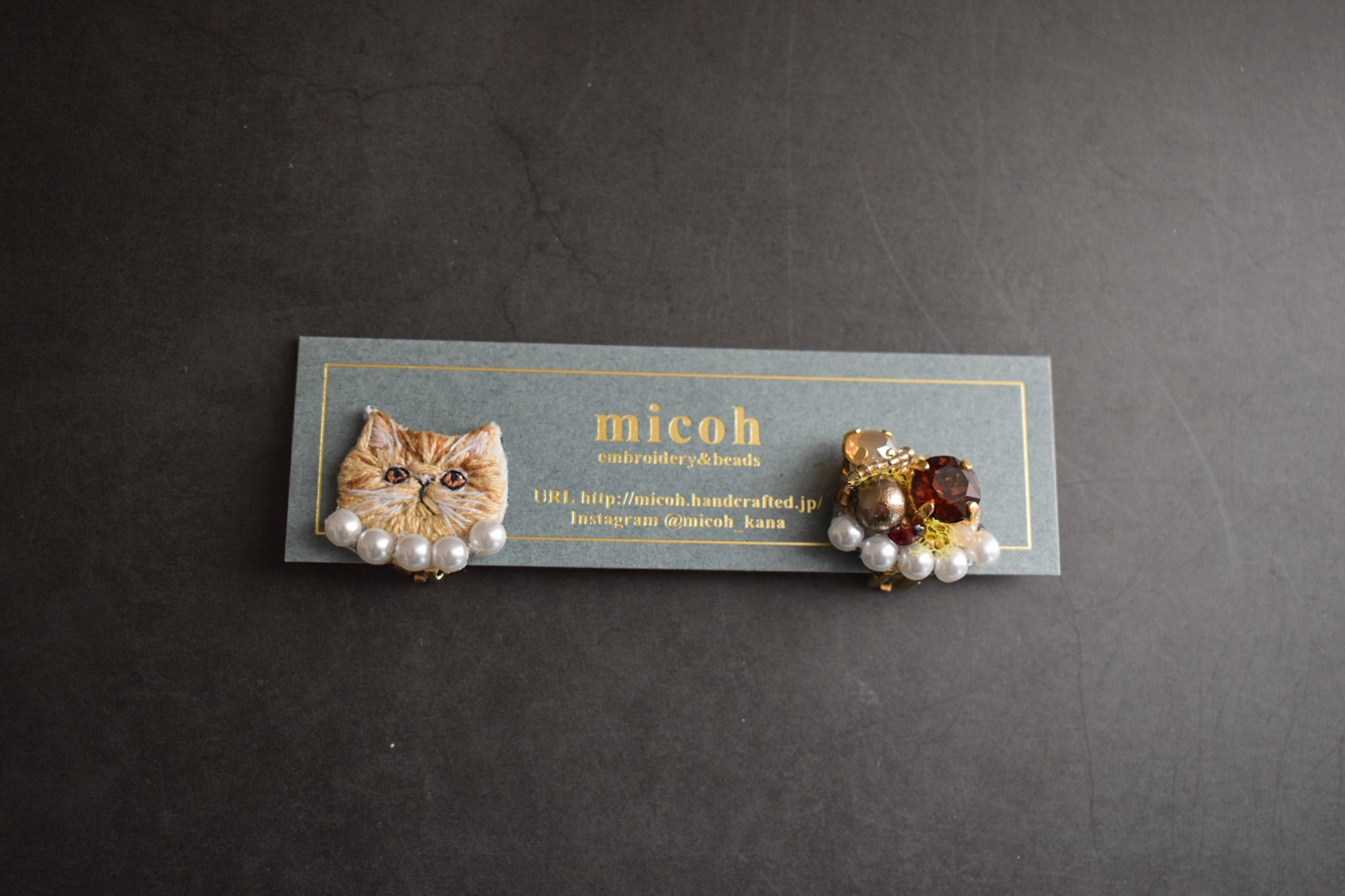 手刺繍で作った猫モチーフとビジューの、左右デザイン違いオリジナルイヤリングです。
