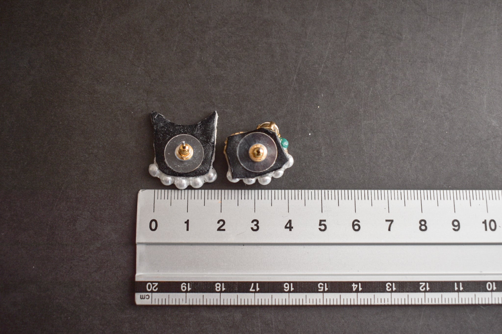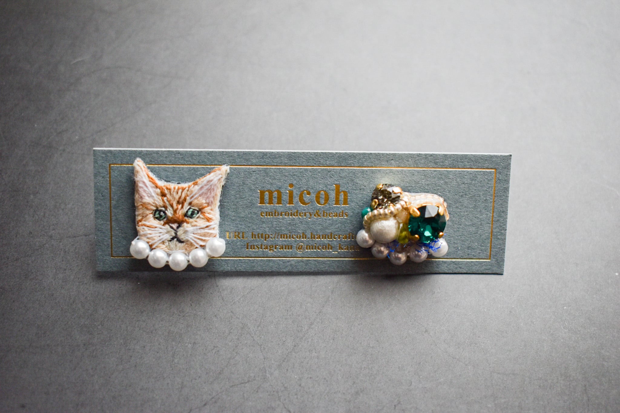 手刺繍で作った猫モチーフとビジューの、左右デザイン違いオリジナルピアスです。