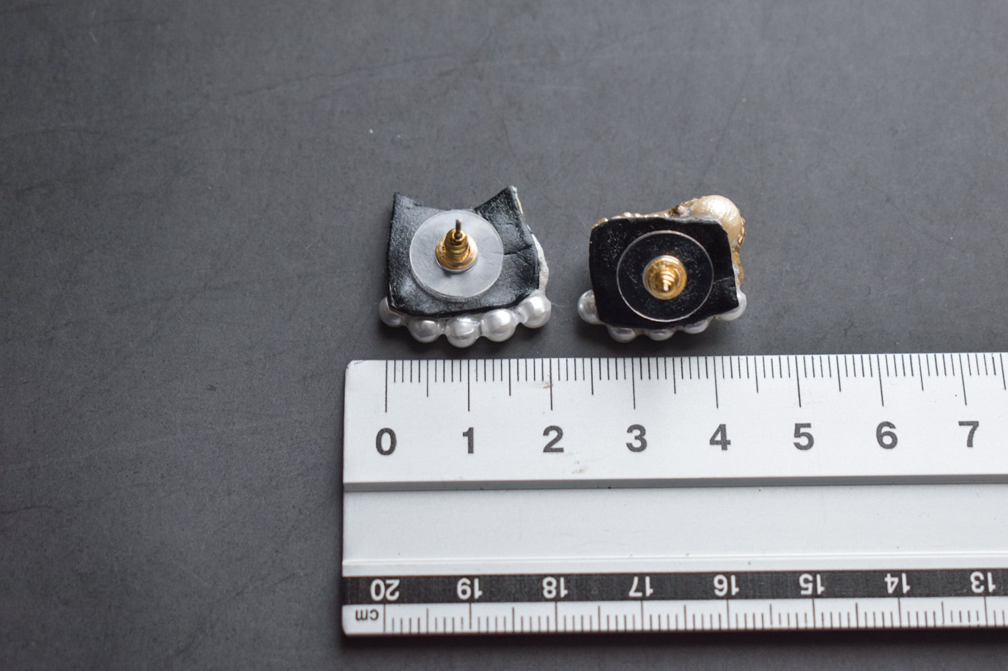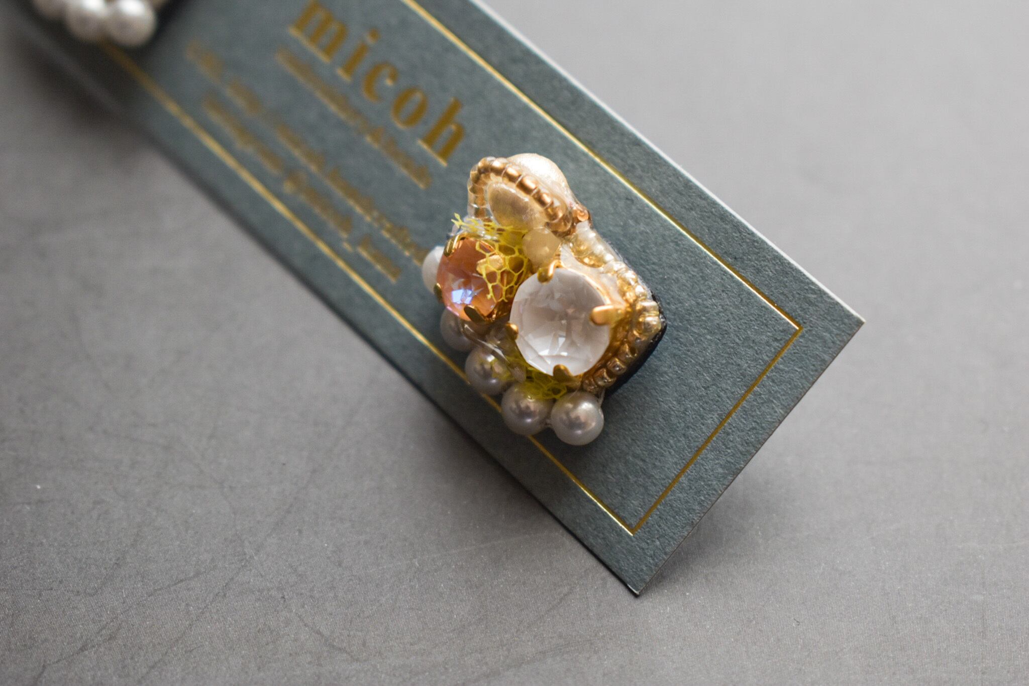 パールラインと、ビジューのパーツ間はレジンで補強しています。力を加えるとレジンが剥がれますのでお取り扱いにはお気をつけください。