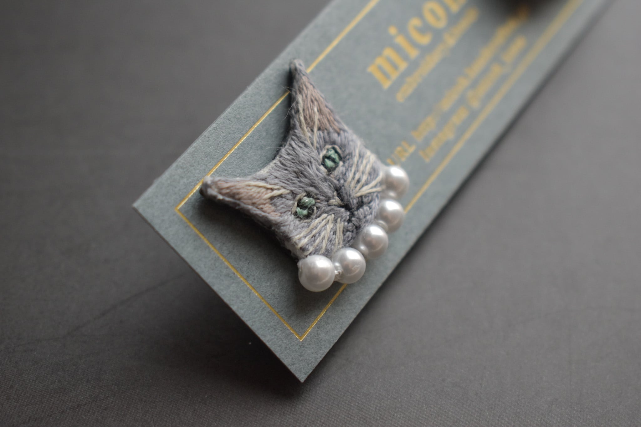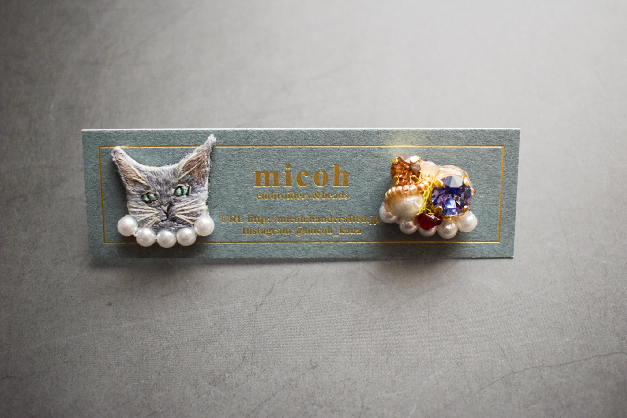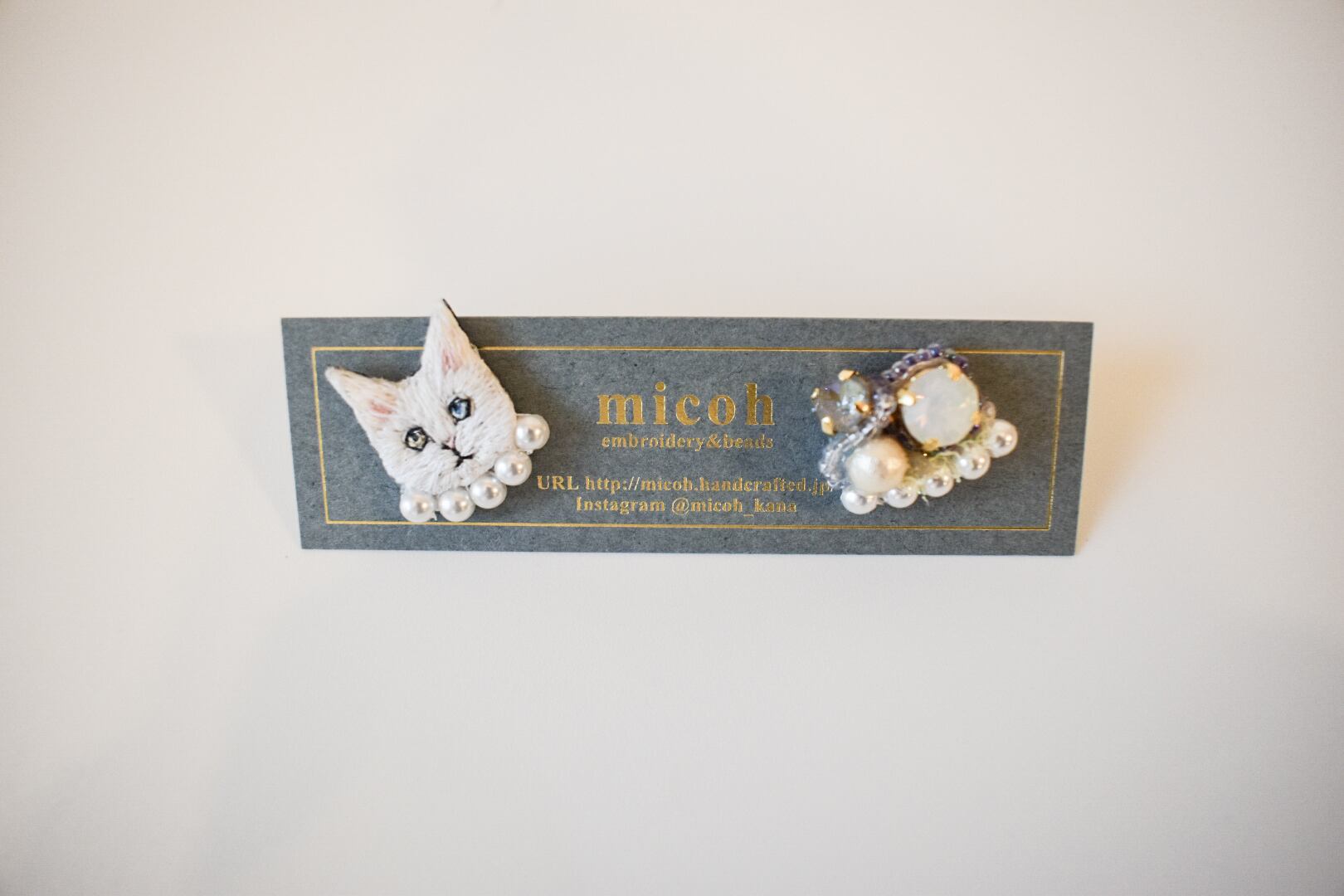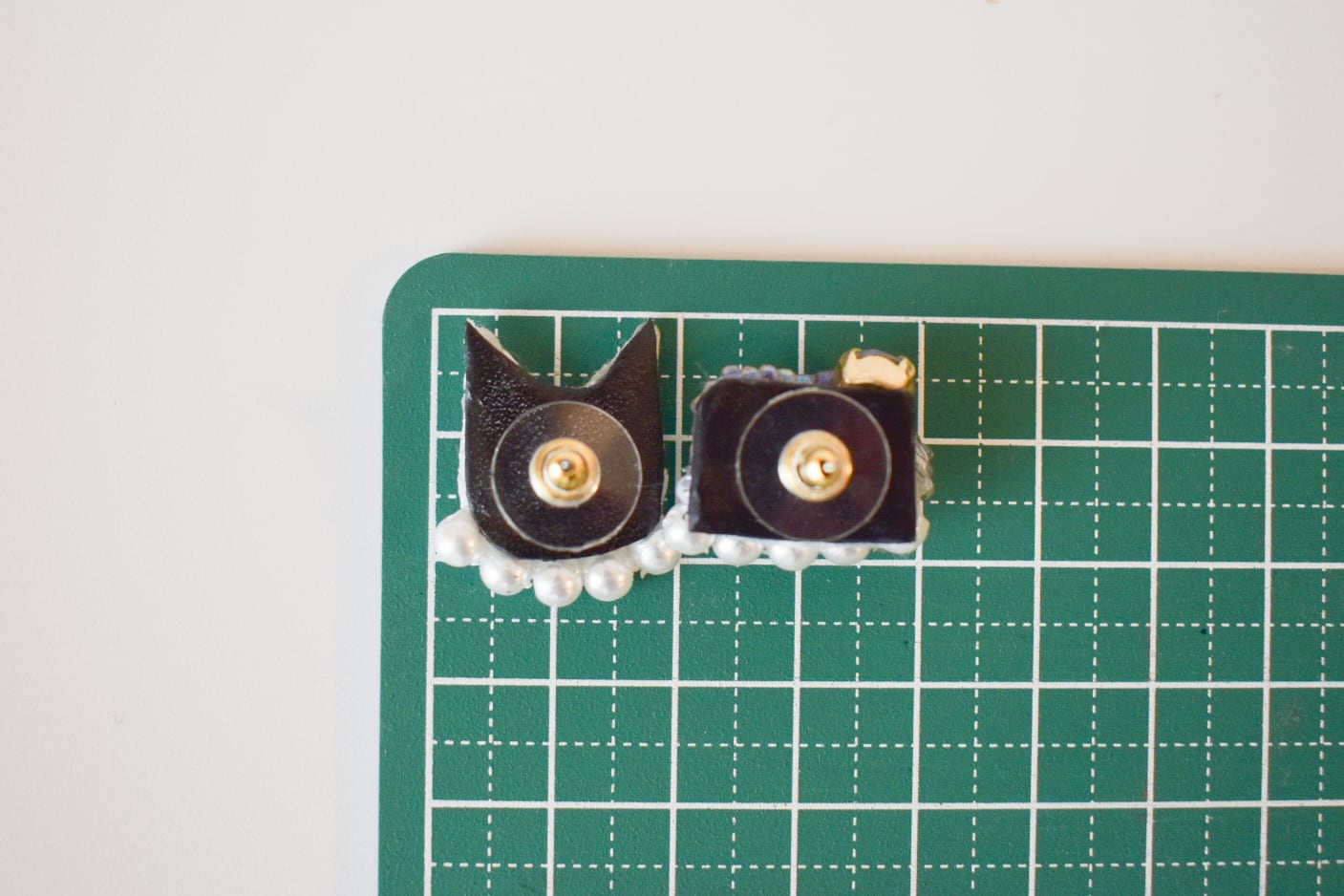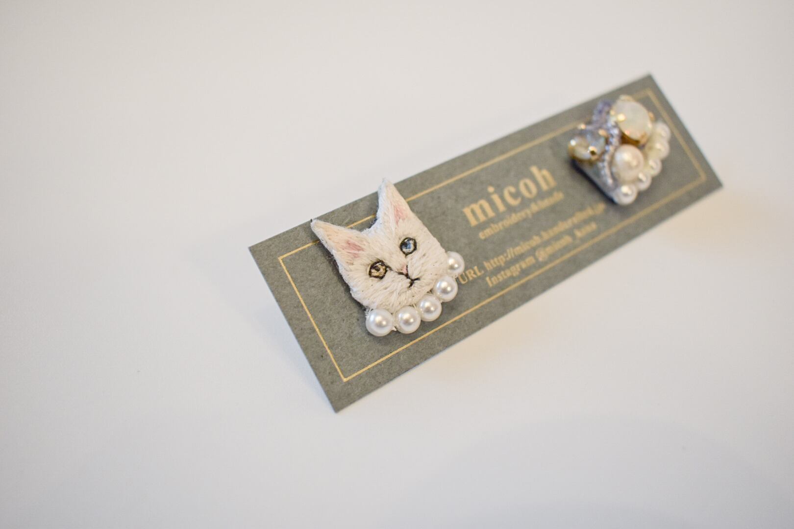 手刺繍で作った猫モチーフとビジューの、左右デザイン違いオリジナルピアスです。