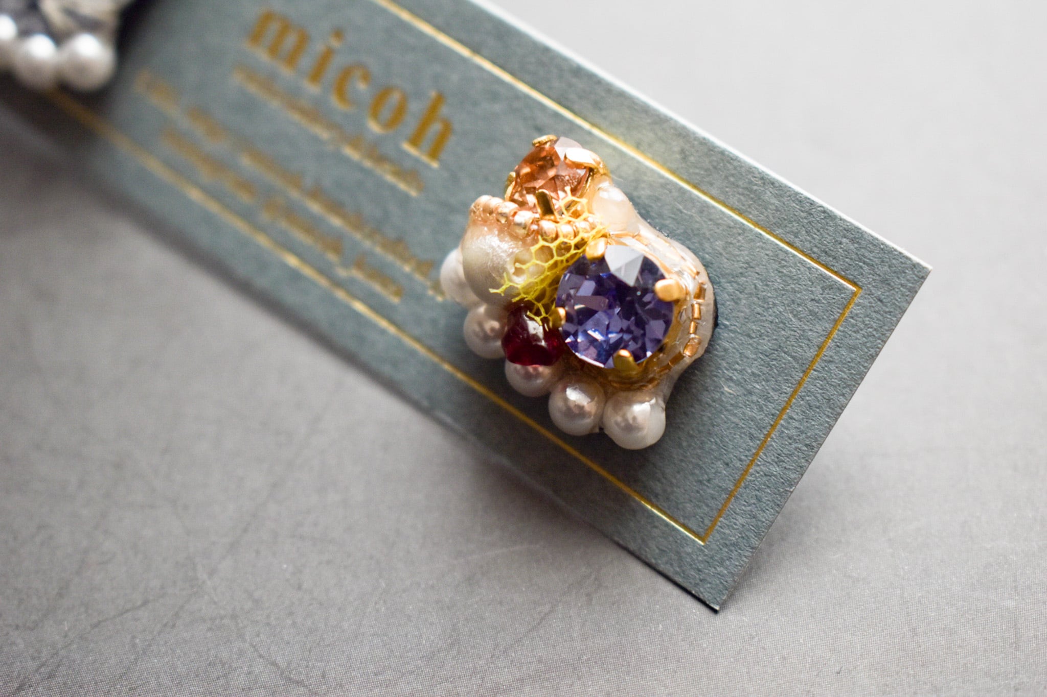 パールラインと、ビジューのパーツ間はレジンで補強しています。力を加えるとレジンが剥がれますのでお取り扱いにはお気をつけください。