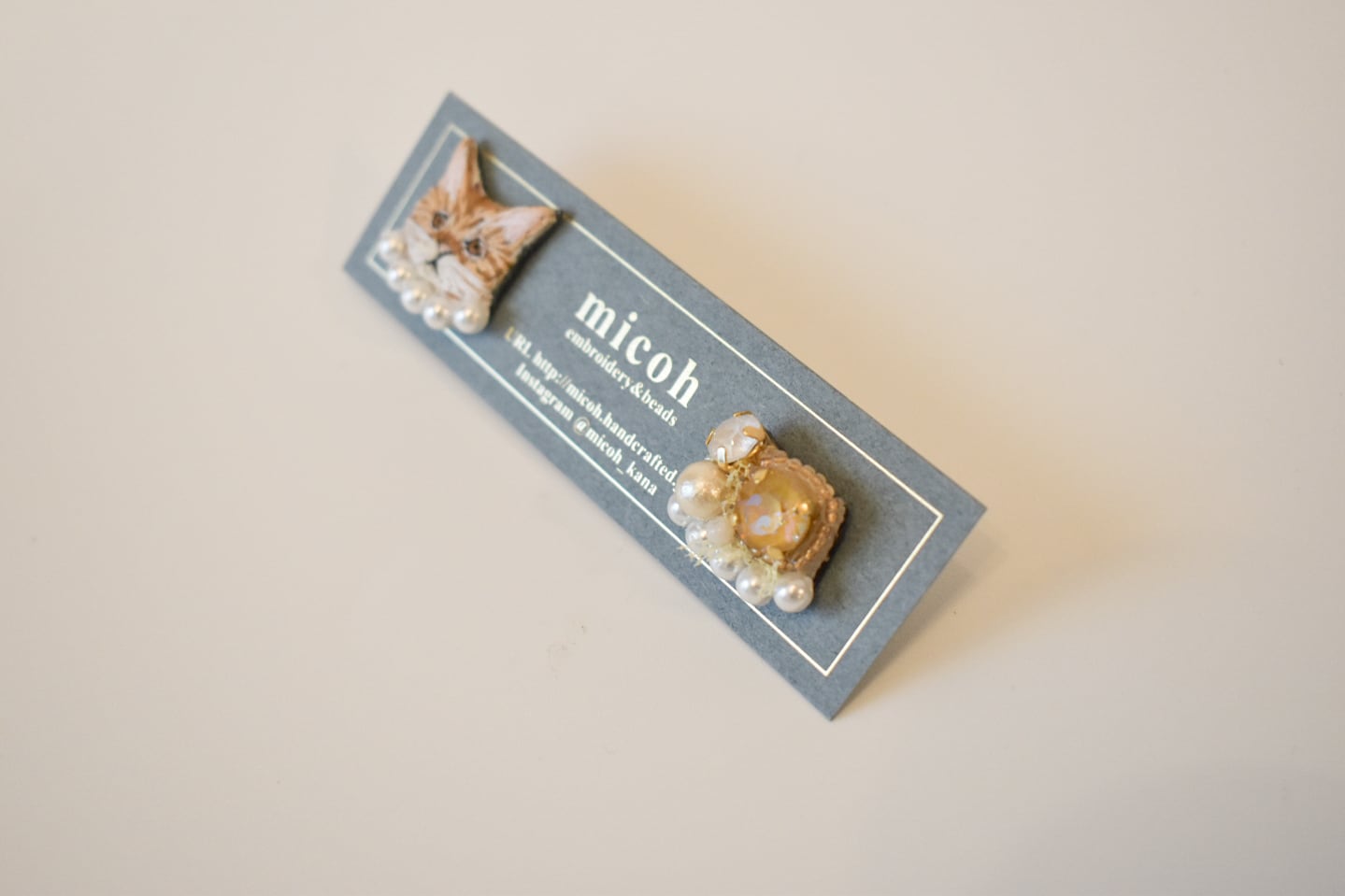 手刺繍で作った猫モチーフとビジューの、左右デザイン違いオリジナルピアスです。