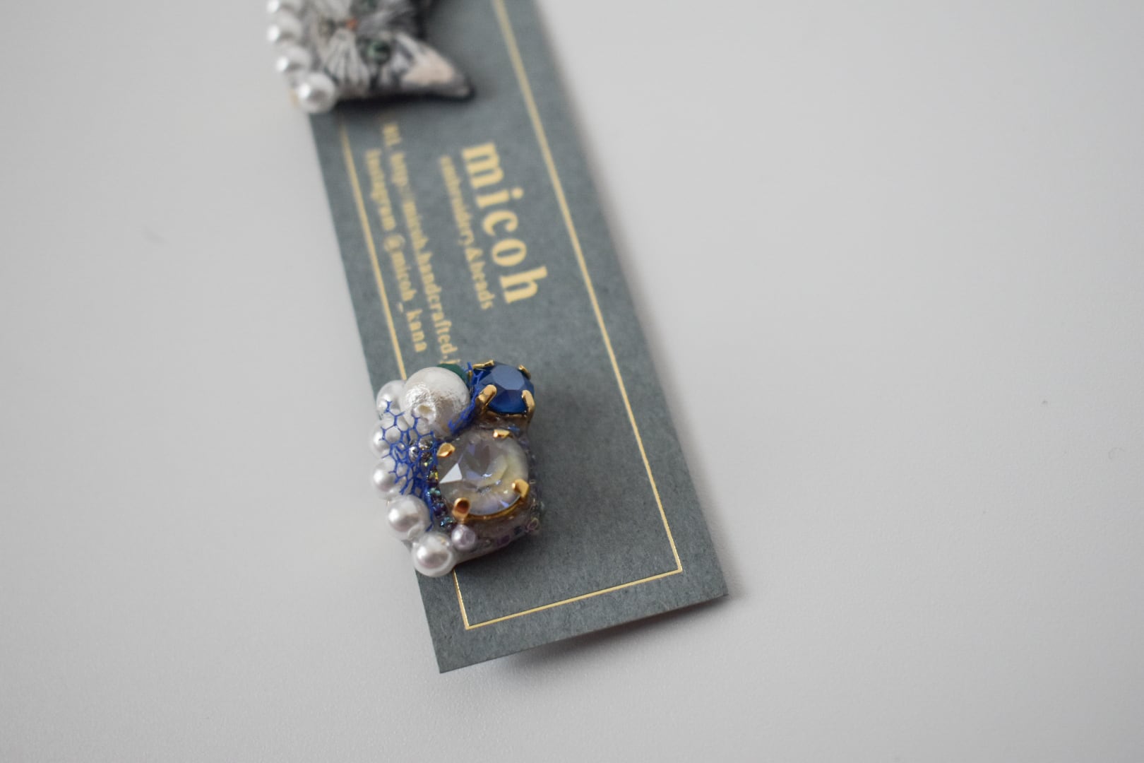 手刺繍で作った猫モチーフとビジューの、左右デザイン違いオリジナルイヤリングです。