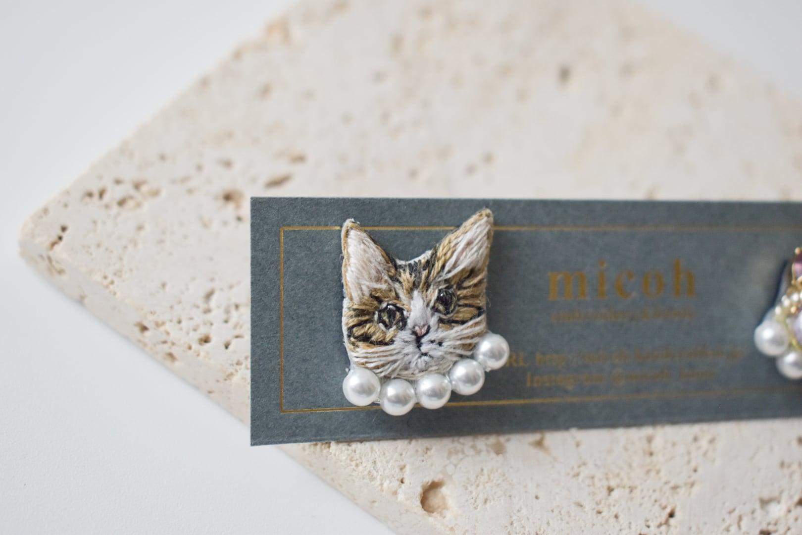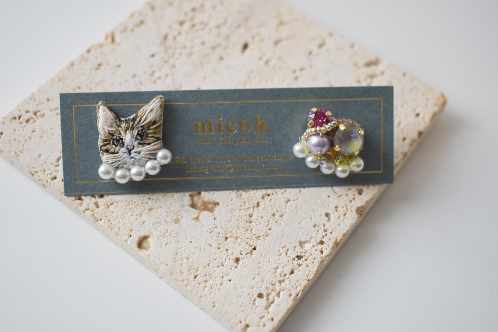 手刺繍で作った猫モチーフとビジューの、左右デザイン違いオリジナルピアスです。