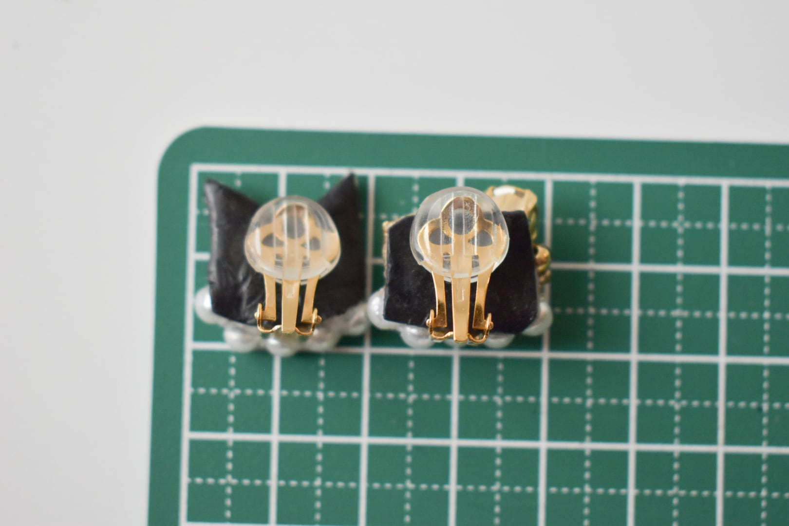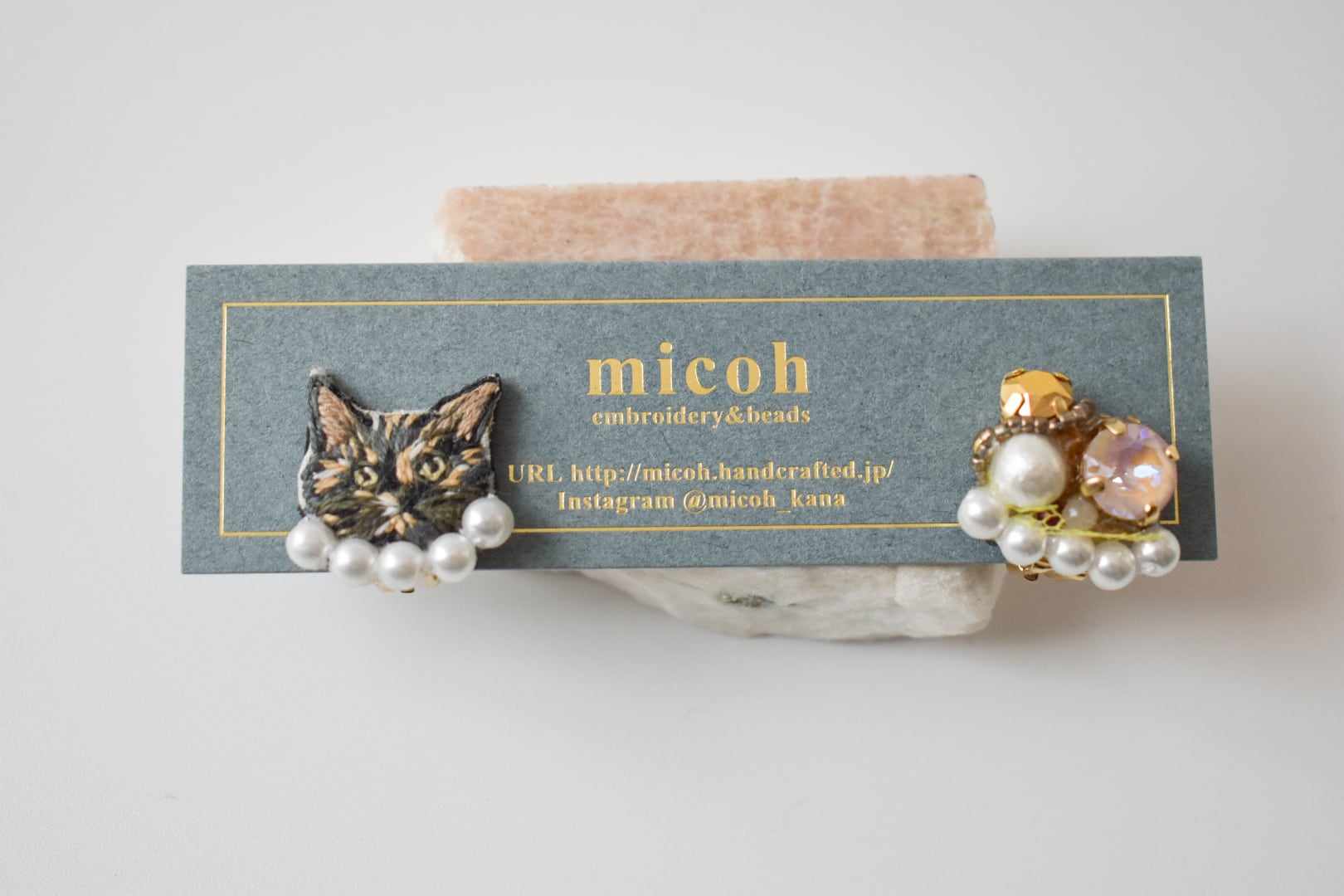 手刺繍で作った猫モチーフとビジューの、左右デザイン違いオリジナルイヤリングです。