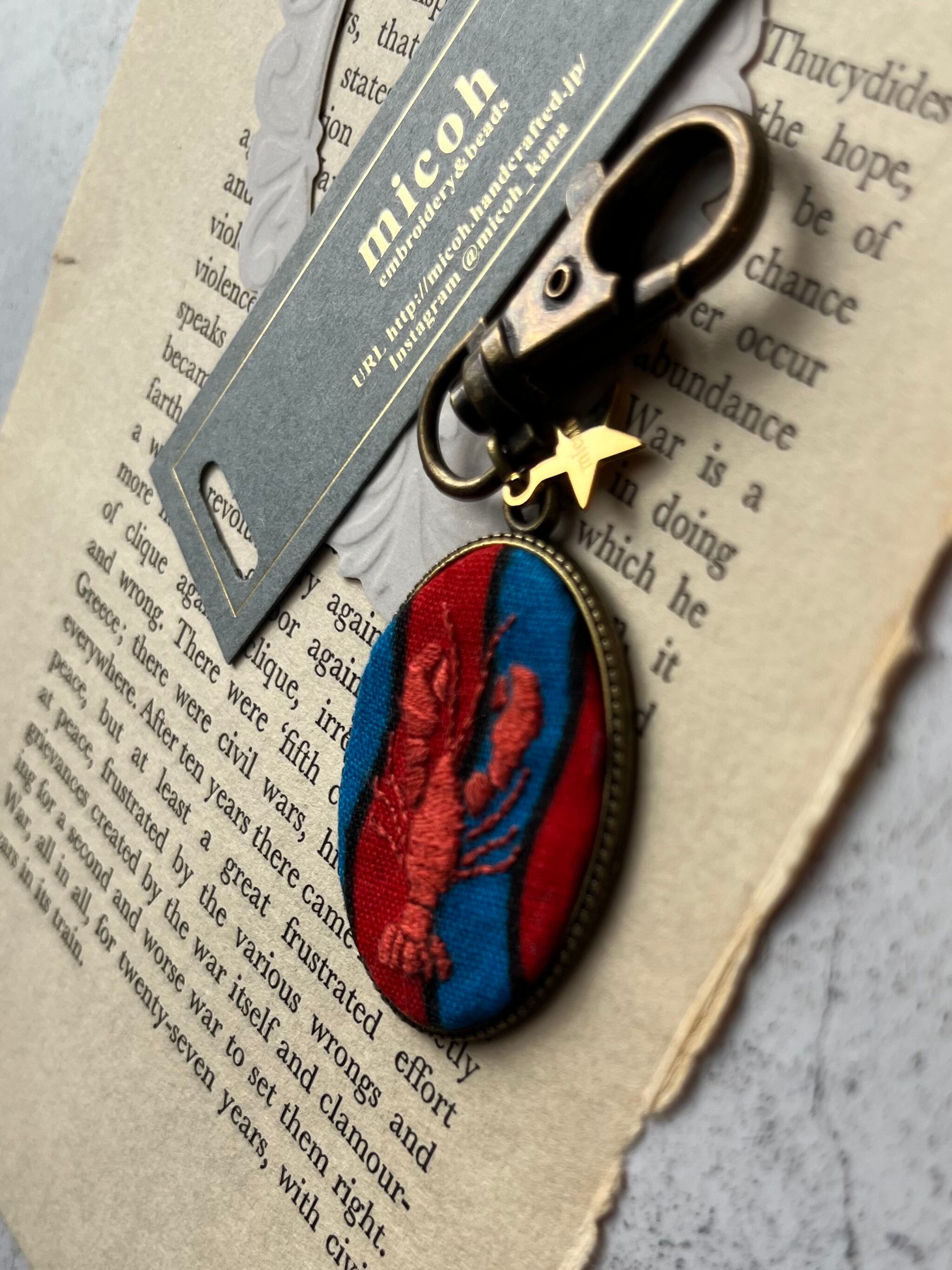 アフリカンバティックにロブスターの刺繍をし、アンティーク風なミール皿と組み合わせました。