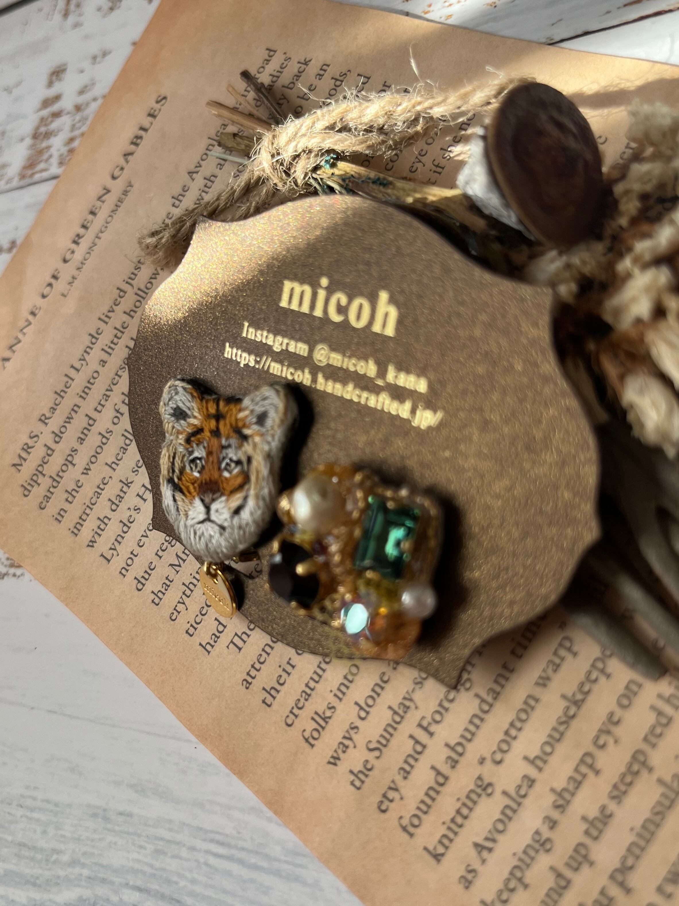 手刺繍で作ったトラモチーフとビジューの、左右デザイン違いオリジナルイヤリングです。