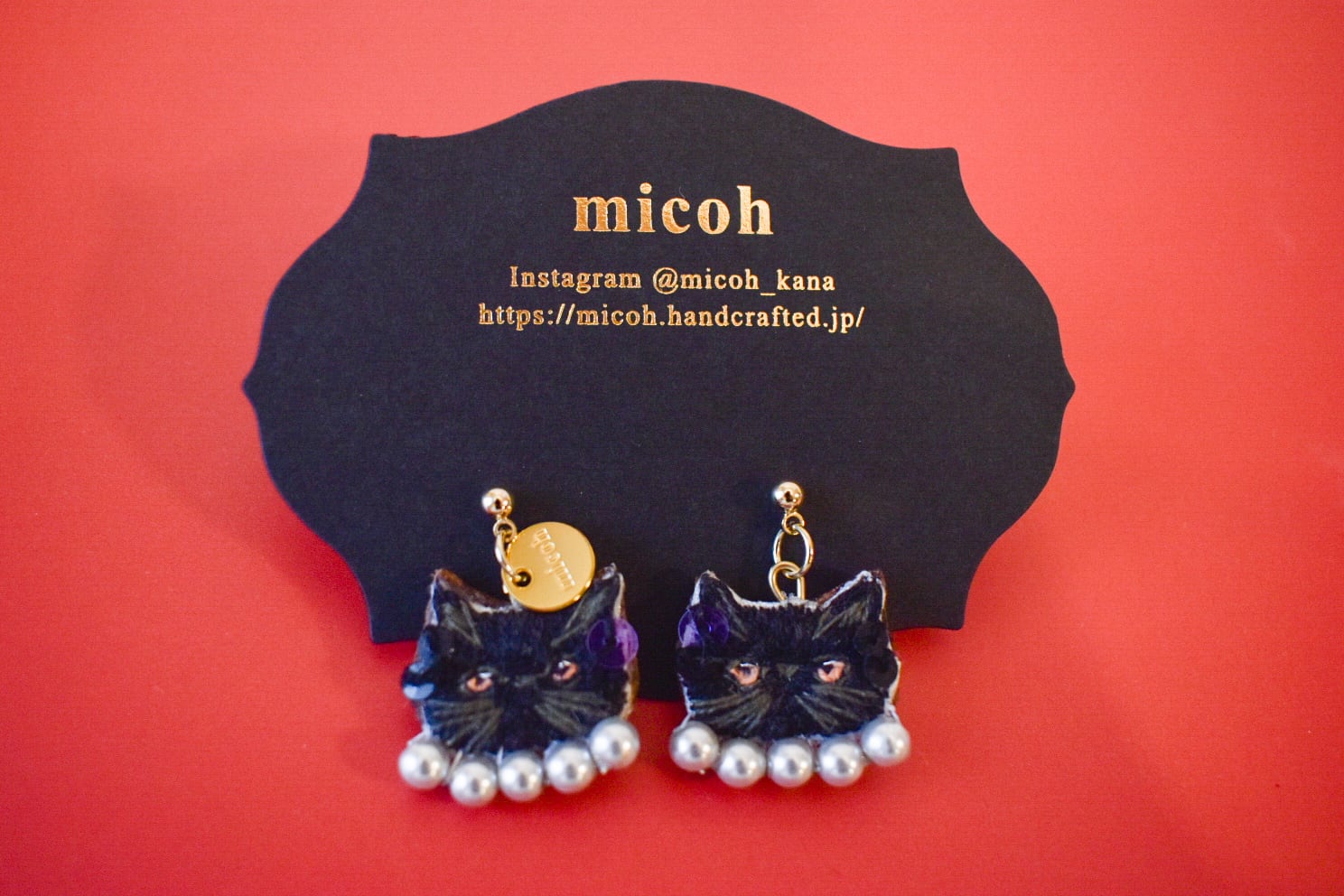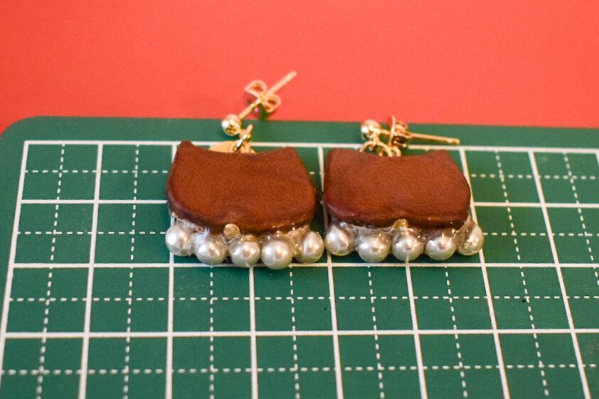 手刺繍で作った猫と樹脂パール、スパンコールを縫い合わせたピアスです。