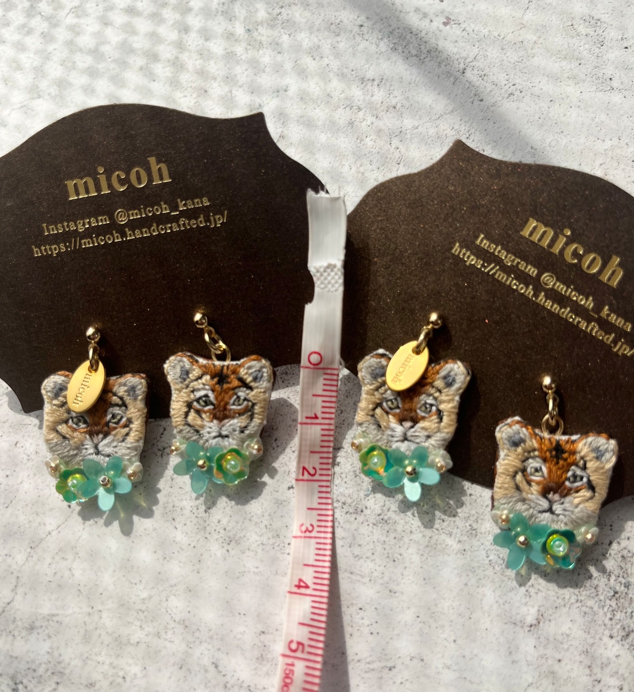 手刺繍で作ったトラモチーフとお花ビーズのピアスです。