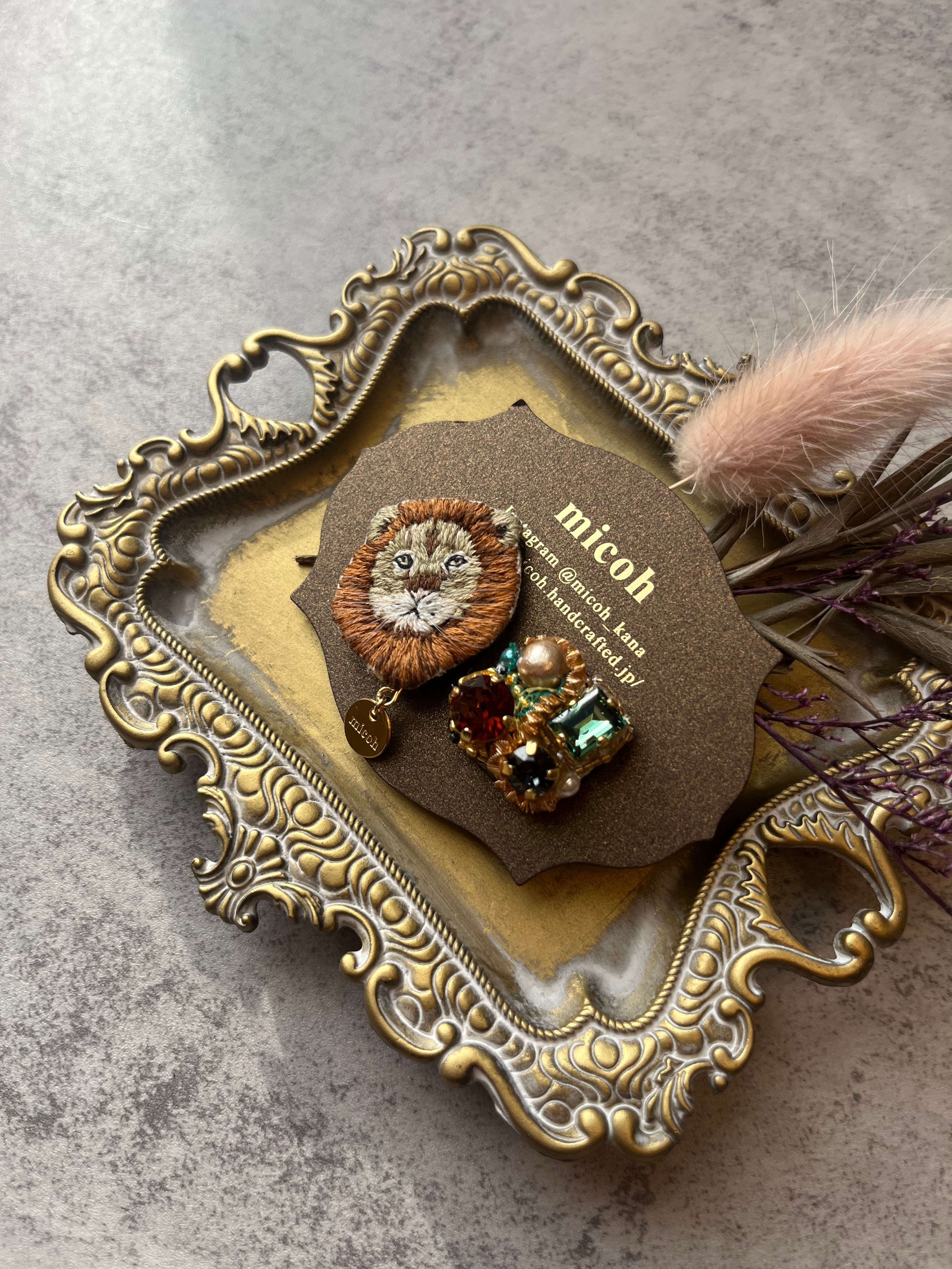 手刺繍で作ったライオンモチーフとビジューの、左右デザイン違いオリジナルイヤリングです。